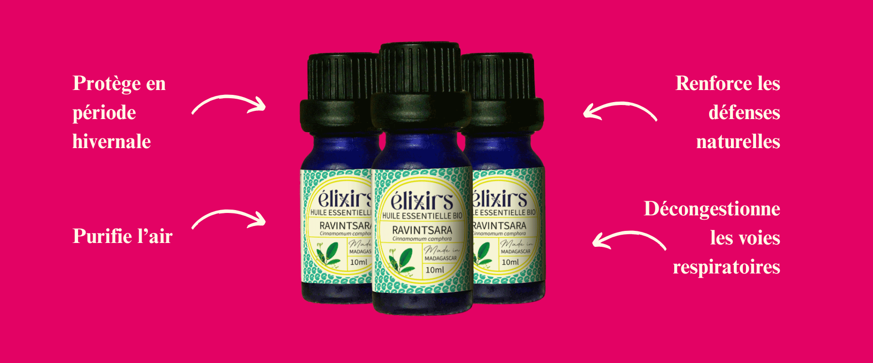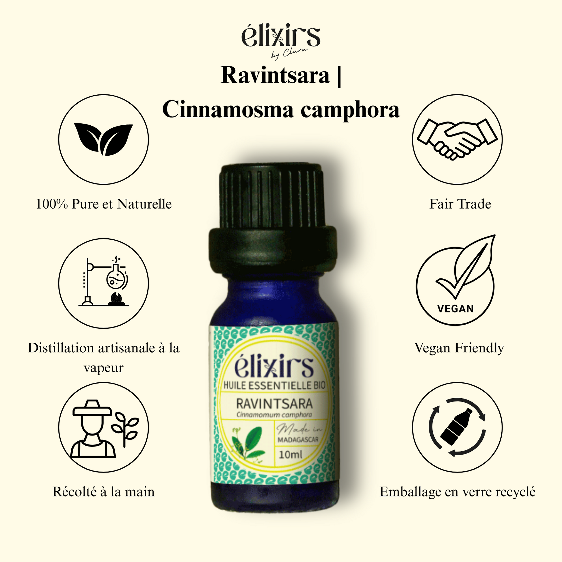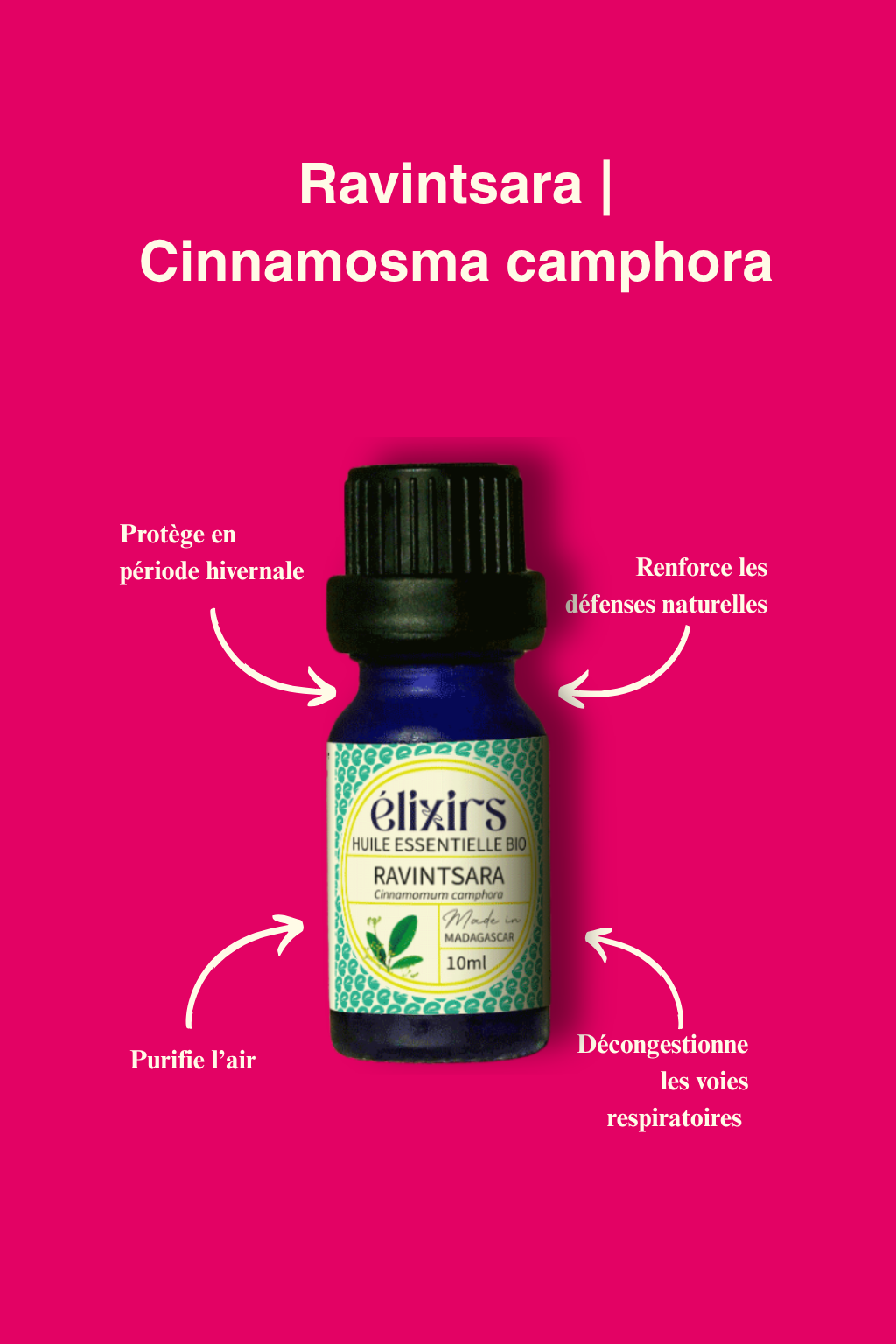 Inhalation à sec : Déposer 1 à 2 gouttes d'huile essentielle de ravintsara sur un mouchoir ou dans vos mains, puis inhaler profondément pour soulager les voies respiratoires et stimuler le système immunitaire