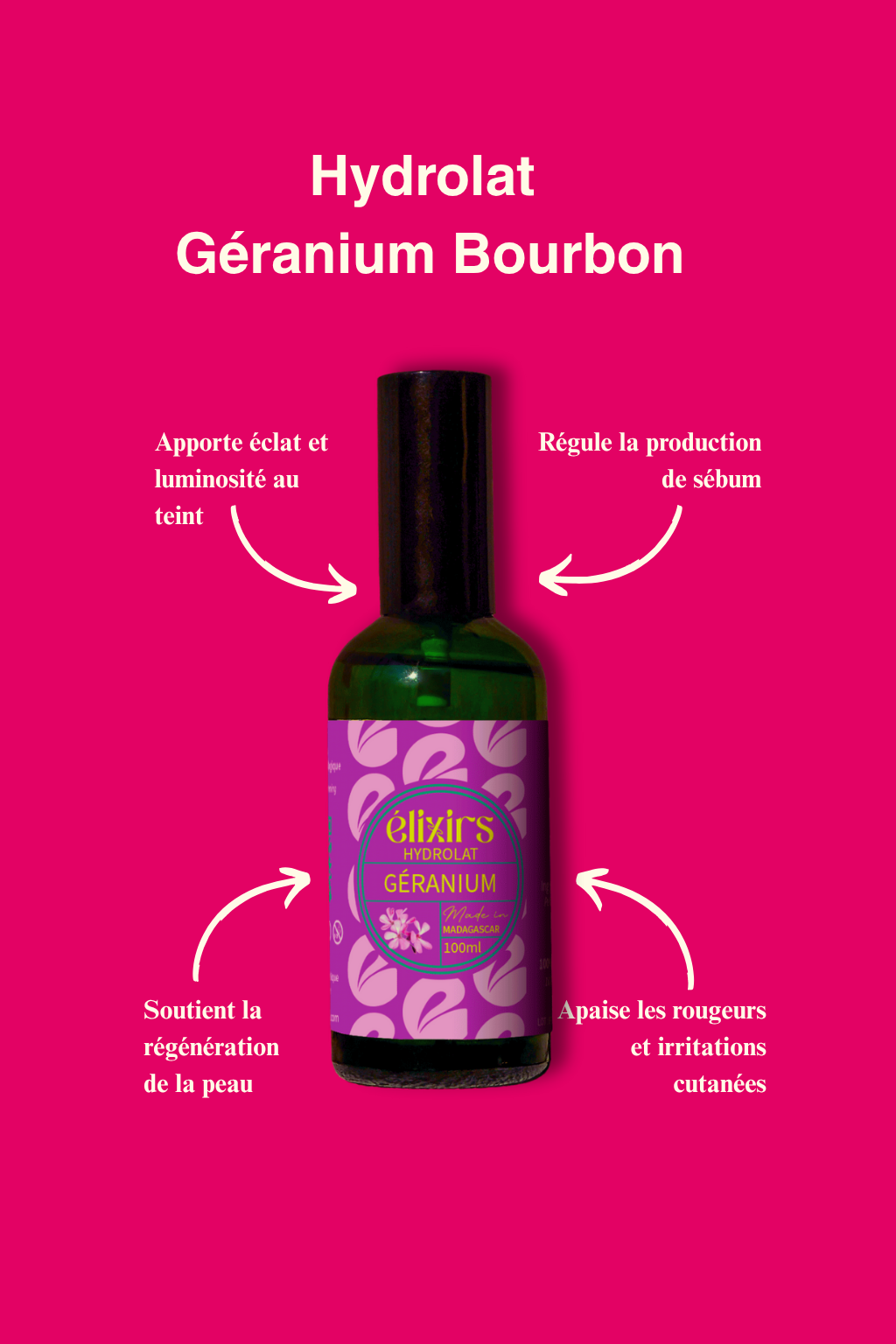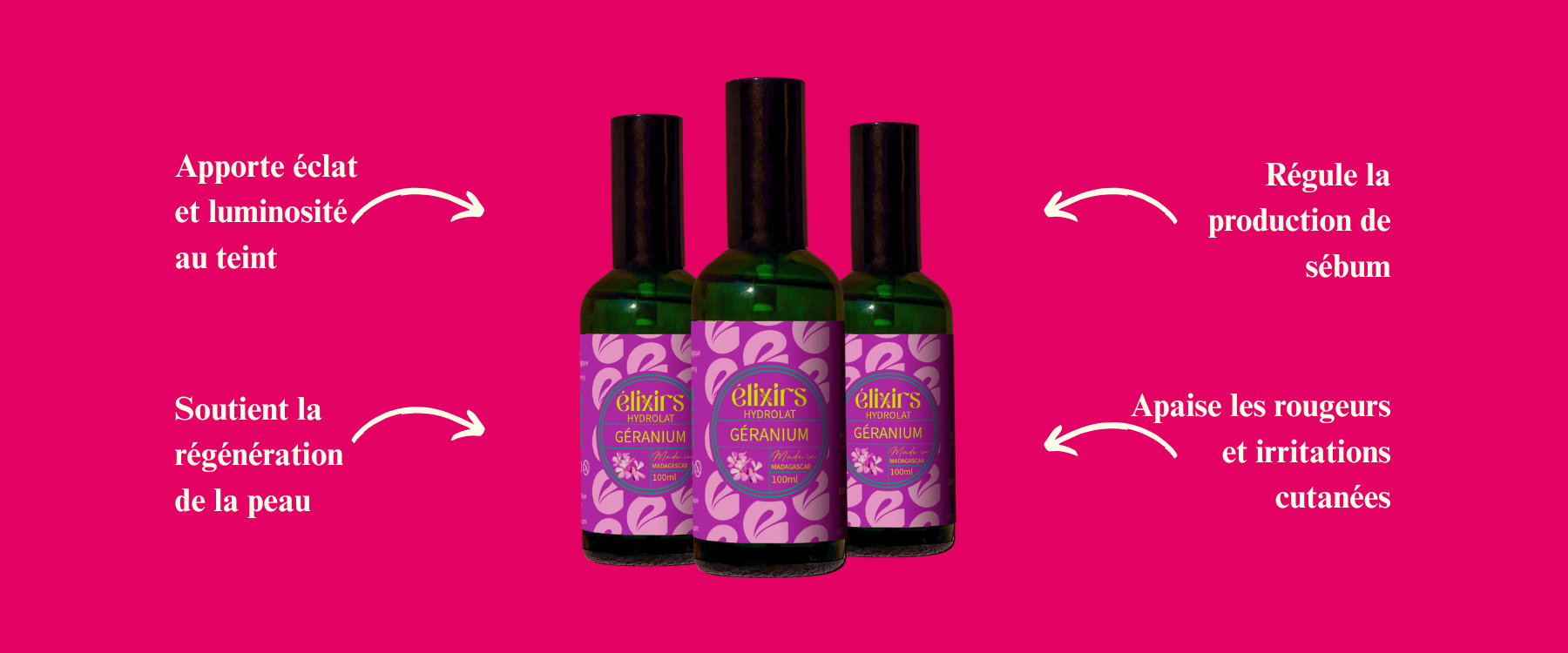 An ideal and natural make-up remover, spray geranium hydrosol on the face and neck, morning and evening, to tone the skin, balance sebum and tighten pores.