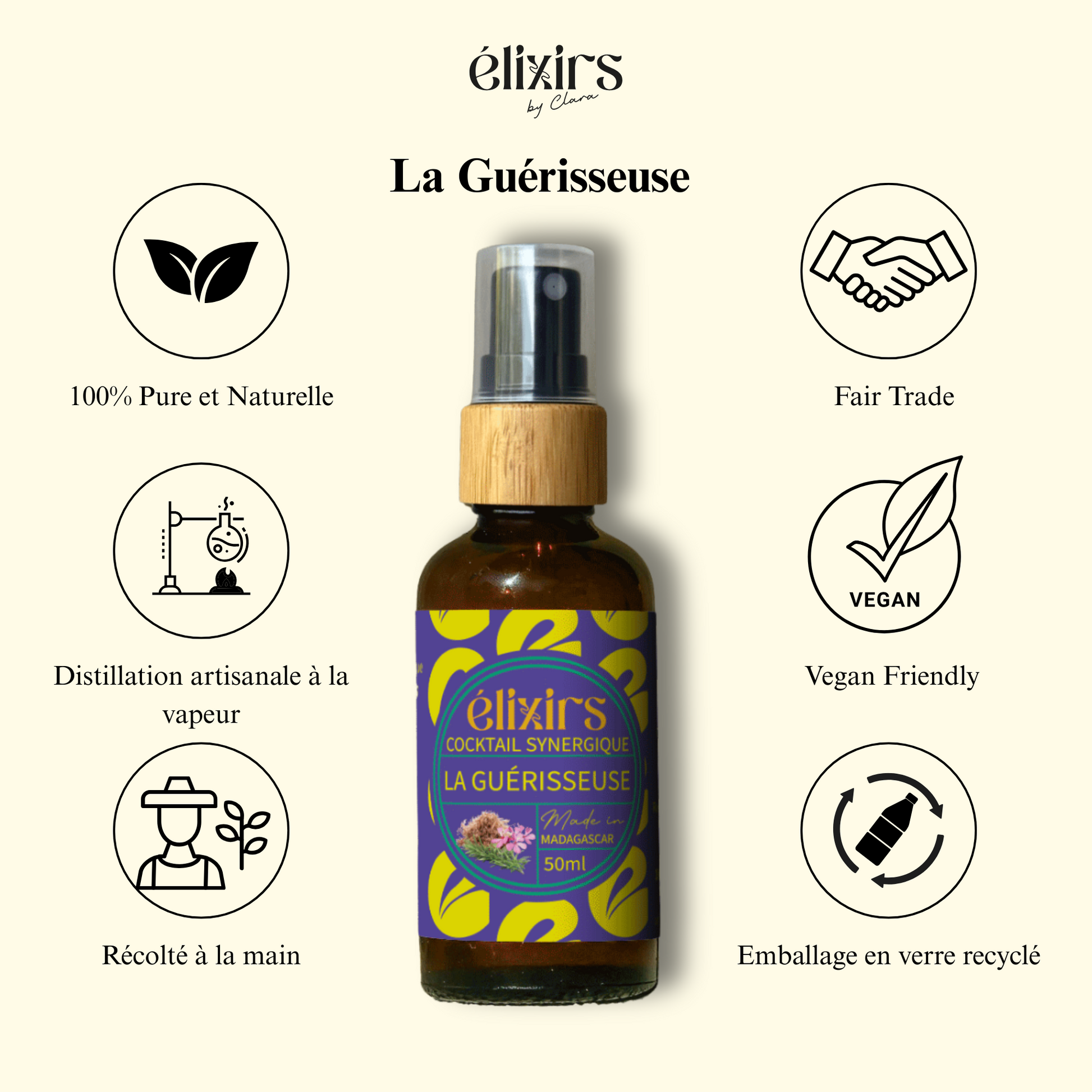 Our synergy of essential oils of Saro (Mandravasarotra), Ravintsara, Eucalyptus globulus, and Eucalyptus citriodora offers a very powerful blend, mainly recognized for its respiratory, antiviral, anti-inflammatory and anti-infectious properties.