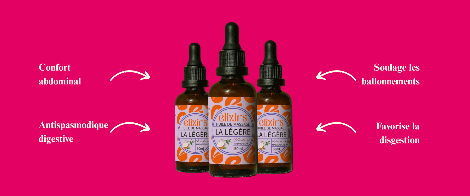 Appliquer quelques gouttes en massage circulaire doux sur le ventre après un repas ou quand vous vous sentez ballonner.