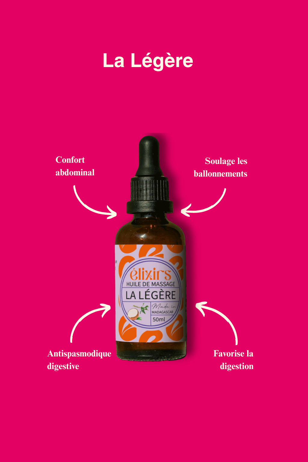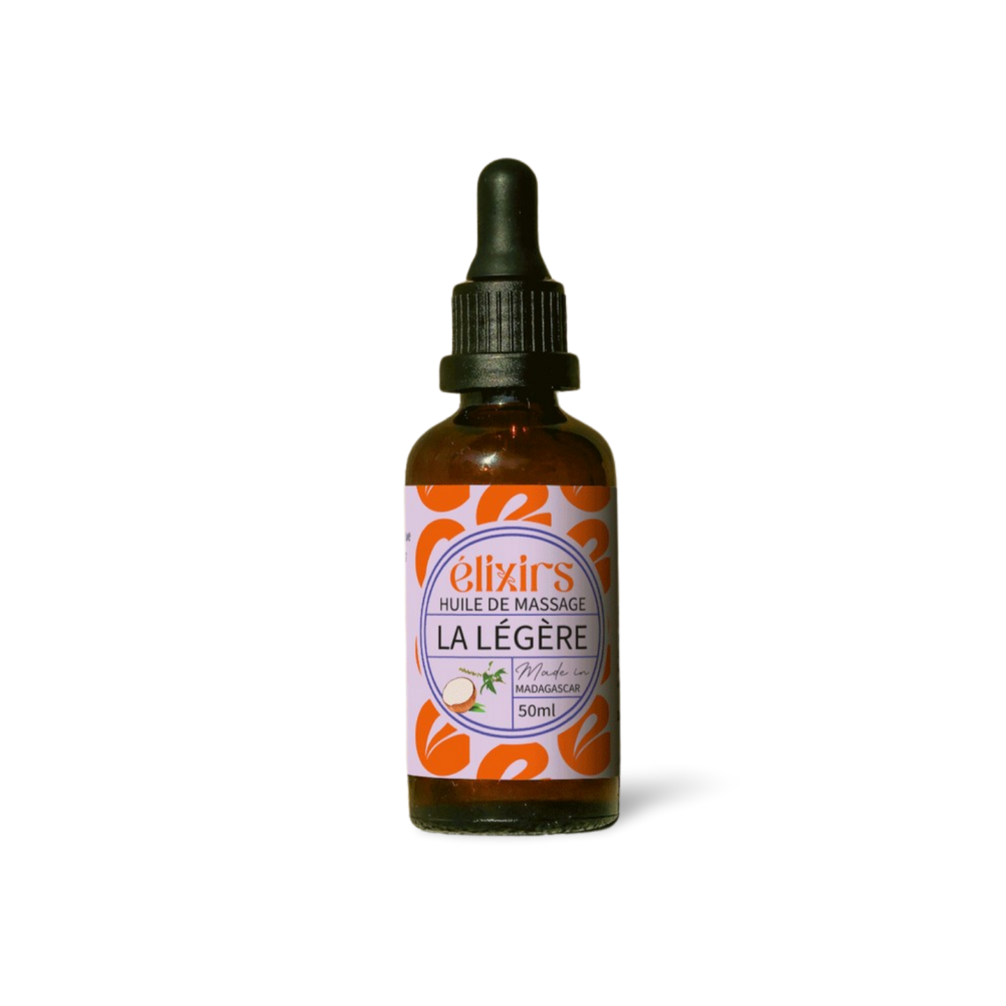 La Légère est une huile de massage 100% naturelle, issue des plantes endémiques de Madagascar. Les huiles essentielles de romba et de saro, cueillies à la main par les communautés locales, sont associées aux huiles végétales bio de calophylle et de coco. Cette synergie ancestrale apaise les ballonnements, soutient la digestion et favorise une agréable sensation de légèreté. Chaque flacon est le fruit d’un savoir-faire artisanal et d’un profond respect de la nature. Un parfum herbacé et épicé, où la douceur du saro se mêle aux notes aromatiques du romba.