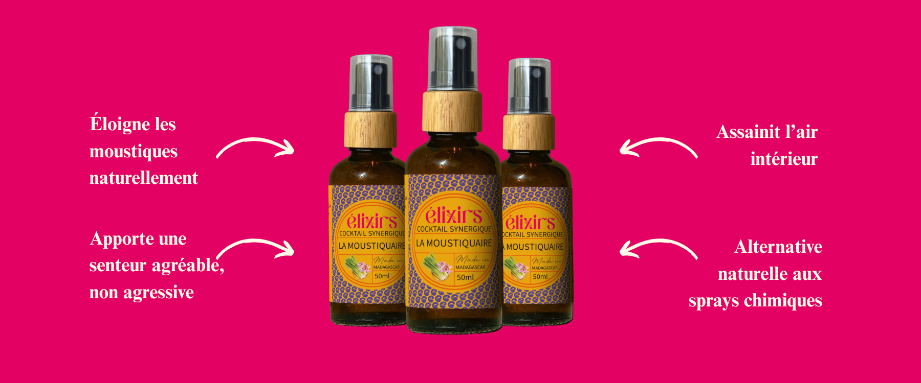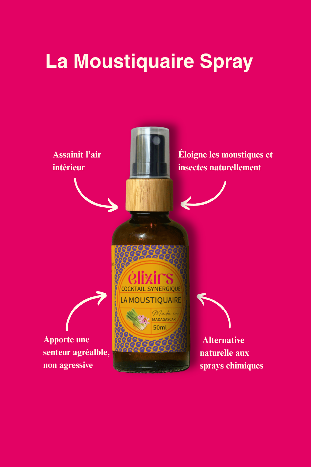 La Moustiquaire en spray associe les huiles essentielles bio de géranium et de citronnelle (Cymbopogon citratus) de Madagascar pour une protection naturelle contre les moustiques. À diffuser dans les pièces, la voiture ou sur textiles, elle assainit l’air tout en créant une barrière olfactive efficace.