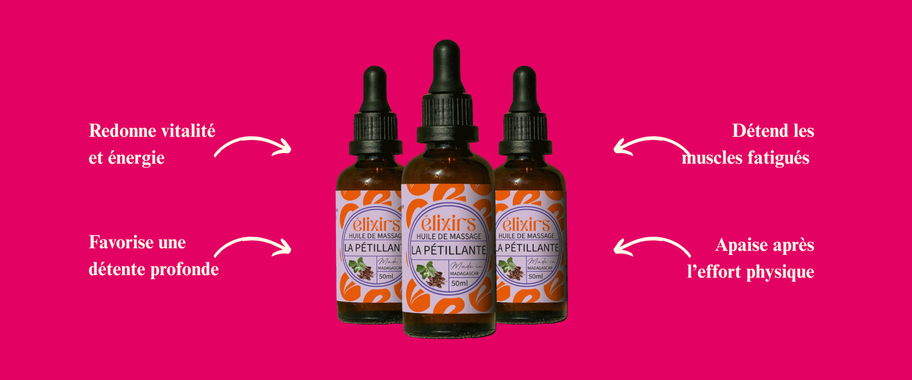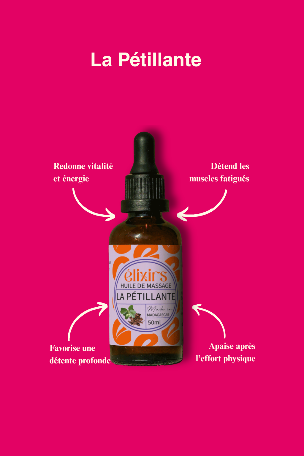 La Pétillante est une huile de massage antifatigue formulée avec des plantes endémiques de Madagascar. Le katrafay, arbre emblématique de la pharmacopée malgache, associé à l’eucalyptus citronné, apaise les tensions et stimule l’énergie. Les huiles végétales bio de calophylle et de jojoba nourrissent la peau et favorisent la récupération musculaire. Une huile qui revitalise le corps et l’esprit.