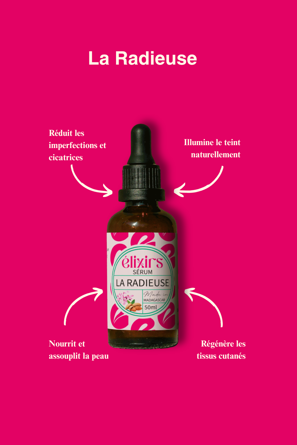 Apply a few drops of the radiant on the skin previously cleansed with the geranium hydrosol of Elixirs de Clara. Massage and insist on the T zone.