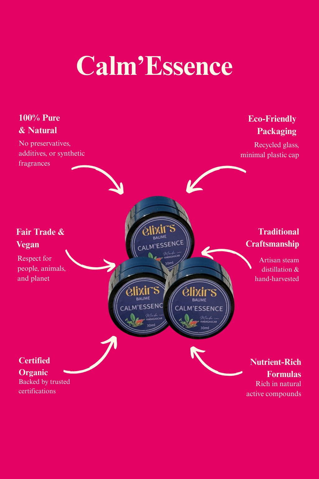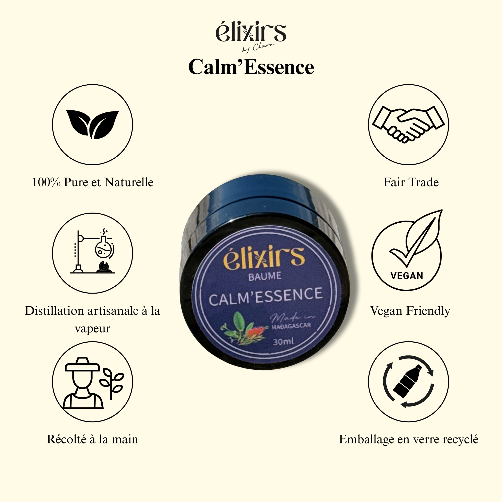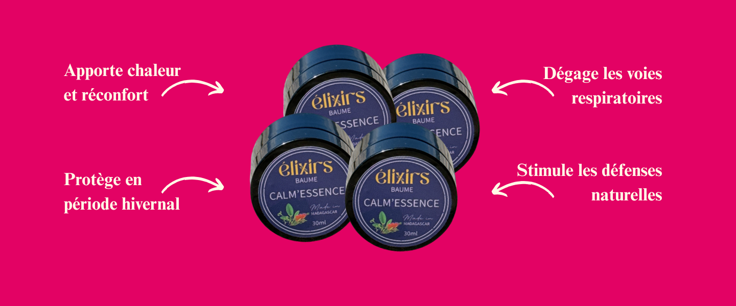 Calm’essence est un baume réconfortant 100% naturel, à base d’huiles essentielles de ravintsara, niaouli et eucalyptus, associées à l’huile végétale de calophylle. C’est l’allié idéal de l’hiver, pensé pour dégager la respiration, apaiser les voies respiratoires et réchauffer le corps. Un rituel ancestral de Madagascar, réinventé pour votre bien-être.