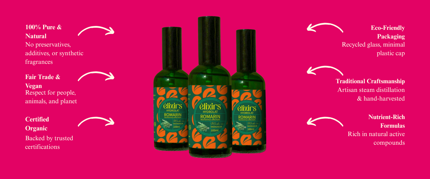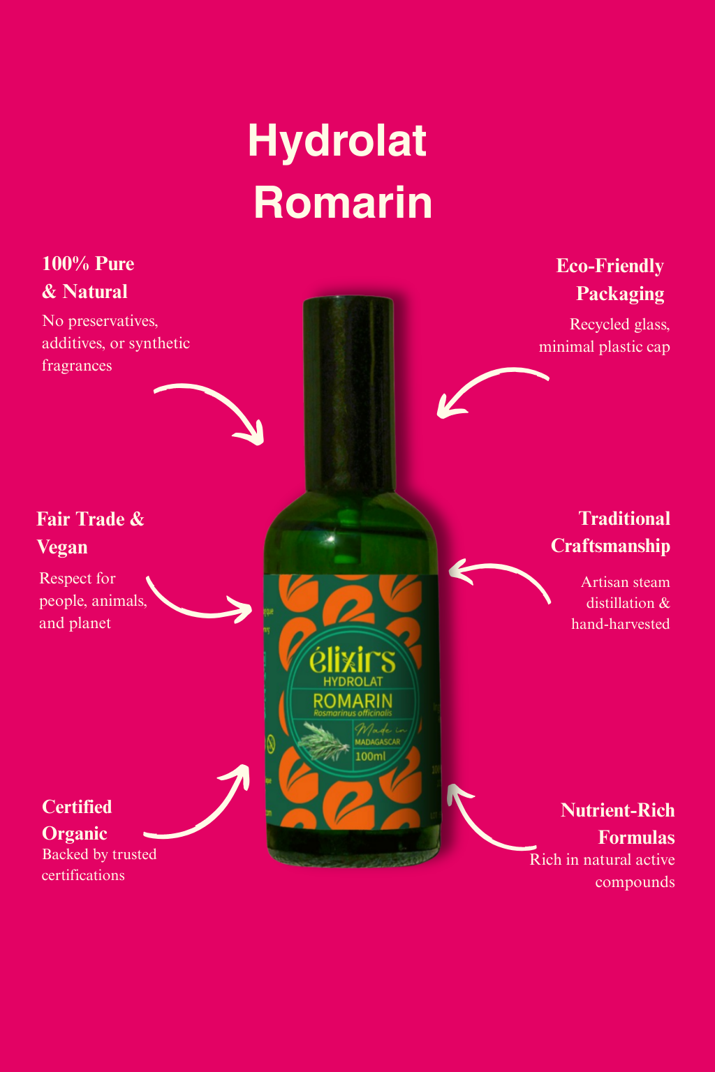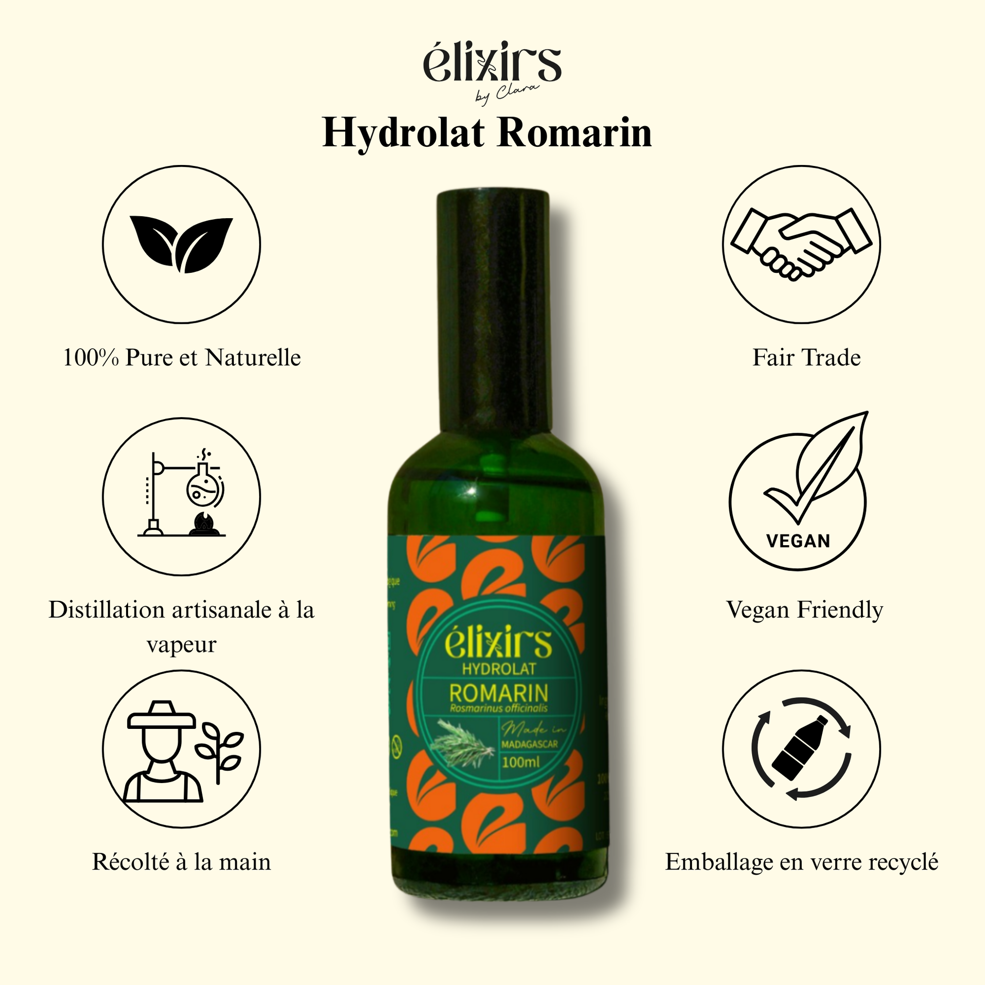 Eau florale aromatique et vivifiante, au parfum herbacé et stimulant, l'hydrolat de romarin obtenu par distillation à la vapeur d’eau des sommités fleuries. Connu pour ses propriétés tonifiantes et purifiantes, il aide à rééquilibrer les peaux mixtes à grasses, ravive l’éclat du teint et soutient la vitalité du cuir chevelu. Son parfum aromatique et herbacé favorise la clarté mentale et la concentration.